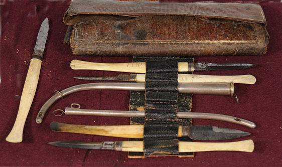 Description: Leather pocket instrument case with 8 instument holders. Contains a silver catheter and 5 miscellaneous ivory handled scalpels with the mark of a crown and a B on each blade as well as Paris. Also in the case is a very rare infant intubation tube of Chaussier, which is listed in the Bernard and Huette Cataloge. The open case measures 4.5“x 7.”
