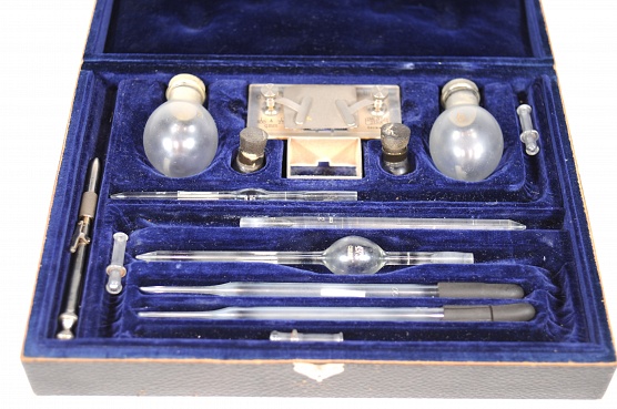 Description: 9.5“x 7“x 2” black box contains counting slide, two small flasks with rubber caps labeled a and b and two very small flasks also a and b, white cell counting pipette, red cell pipette, third measuring pipette, two diluting pipettes and mouthpieces as well as an automatic lancet.