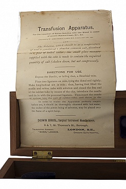 Description: 13.25“x 3.25“x 2” pinewood box contains a 12” glass syringe, 1.25” diameter with asbestos wrapped plunger.. There is also a clamp in the box, a large needle and a 0.5“x. 5” measuring glass as well as rubber tubing to connect the syringe to the needle. Abstract of an article from lancet by W. Arbuthot Lane, Sept 13, 1891 is pasted in lid and a midwifery article is pasted on the outside of the lid (see illustrations). All fitted in case. This is a remarkable example of early attempts at transfusion and fluid replacement. Probably used for hemorhage during childbirth.