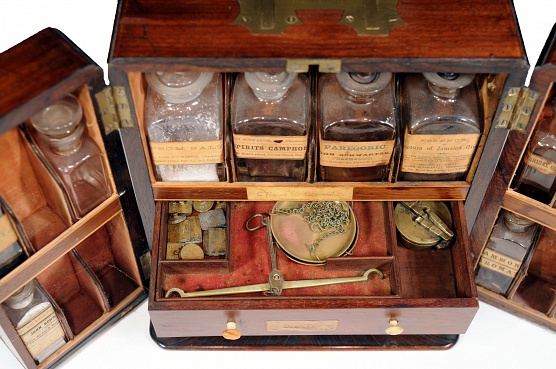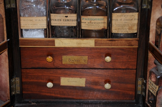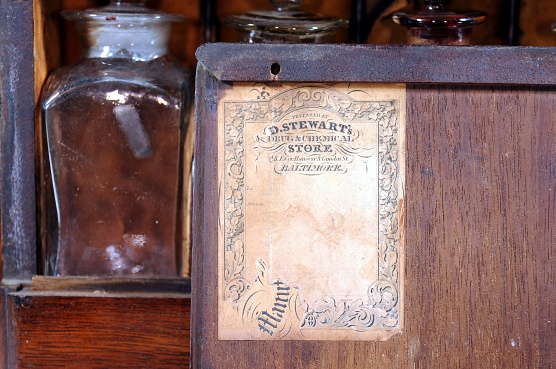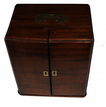 Description: 9.5“x 10.5“x 7” mahogany cabinet with drawers which open to reveal shelf. Poison cabinet in rear contains four pontilled bottles. Stewart label on cover has been pasted over original mnfr. Although the visible label is D. Stewart, there is a small portion in the lower left corner worn off under which can be seen the label of Nathan Starkey as shown in the last image. This suggests that although most medical chests were imported from England, this one (according to Dr. Mark Fortini) was very likely manufactured by Nathan Starkey in Philadelphia around 1850. 4 original pontilled bottles in main cabinet. 5 of 12 in doors. 3 original. Handwritten label says C. Winslow, M.D. Pharmacist. 2 drawers contain replacement wts and scales. Letter of Winslow’s life that was obtained from his granddaughter is in the chest.She discovered that I owned the chest when her granddaughter who worked at the Maryland Historical Society received a letter from me inquiring about Dr. Winslow. His son was a doctor as well. According to her note Caleb Winslow received his MD from the University of Pennsylvania in 1849. He graduated Haverford College in 1842, which was previously the Philadelphia College of Pharmacy (thus his designation pharmacist). He practiced in North Carolina from 1849 to 1870, then moved to Baltimore. He took over the practice of his deceased brother Dr. John Randolph Winslow. He was blocked from going into surgery by “colleagues” and practiced general medicine and obstetrics. He retired in 1890 and died in Baltimore in June of 1895. He is said to have operated on 100 cases of bladder stone with only one death prior to coming to Baltimore. He also served as an examiner in Surgery on the original board of medical examiners of North Carolina. His biography (slightly different from his granddaughter’s version) can be found in Cordell, E.F. The Medical Annals of Maryland 1903.