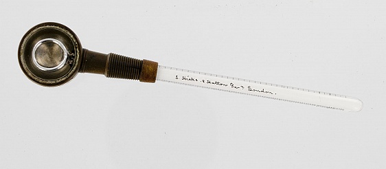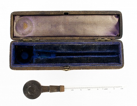 Description: 5“x1.25“x7/8” red leatherette box with red velvet lining contains 5’ thermometer including a 1” circular end which contains a surface coil, the thermometer is inscribed S. Hicks 8 Hatton Gardon, London. It is lettered by hand from 76 to 110. There is a .5” button on the back of the surface coil.