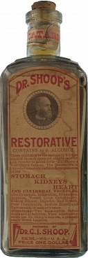 This quack cure is mentioned in the AMA book on Nostrums and Quackery (ref 68, 69). The company was fined for untrue claims by the FDA. The bottle is 7“h x 2 3/8” sq. It has a very attractive label with an engraving, presumably of Dr. Shoop. A label around the neck of the bottle reads Catarrh. There is also a label written in German and the bottle is embossed on several sides.