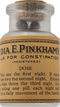8 “x 3” x 1.5” embossed as above 14.5 oz Blood Purifier . Also shown is a small bottle of Lydia Pinkham’s pills for constipation.. It is 2 1/4” x 1 1/4” and contains small brown pills. Lydia Pinkham was one of the most successful of all of the quack medicine makers.