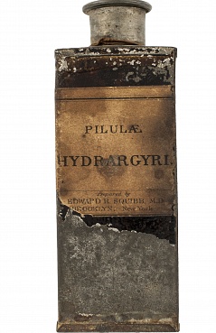 Description: Three corked tins with paper label and contents. All three are labelled prepared by Edward R. Squibb, Brooklyn, NY. Squibb was a major supplier during the American civil war. A main distribution center for the war was located nearby in Astoria, Queens. Squibb began in 1858 at 149 Furman Street in Brooklyn, NY. The product label changed to E.R. Squibb and Sons in 1892. Many army medical chests contain this type of tin.The largest tin is 4 1/8” high and 2” square. It is labelled:Pulvis Ippcac Et Op11. Under the title it appears to read: pills, containing each five grams. A second tin still has its paper seal and is labelled: Extractum O-Ihici Se-Ini Elitidium. Under the label it reads “each minum represents one gram of colcicinum and then the pharmaceutical quantity. It is 4 3/4” high and 1 1/2” square. The third is labelled Pilulae. Hydragyri and it is 4” high and 1 1/2” squ are. This is the best preserved label. The labels can be read by clicking the magnify button and moving over them.