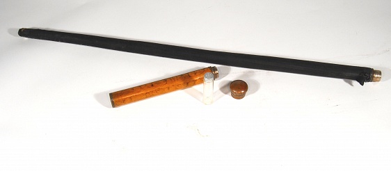 Description: 31x.77” wooden cane with slight taper. The bottom 23” is covered with a black cloth which is glued on and has a ring presumably for a loop. The section above this is made from walnut burl. It unscrews to reveal a partial hollowing out of the top and the remainder of cane is hollow Copper (formerly silver) cap unscrews to reveal another hollow with blown glass vial with screw on cap, fancy initials BCE.