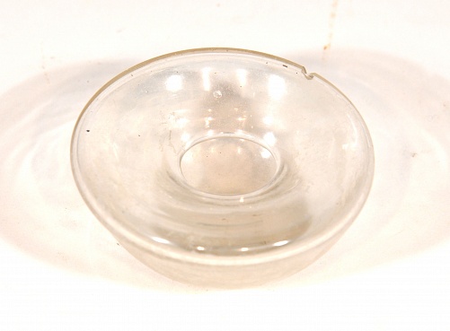 Description: 3.25×1” clear glass vessel. There is a 1” hole on the top to insert the nipple and a small notch on the side to empty the vessel and allow air to exit. Polished pontil mark on base.