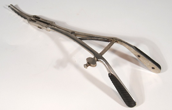 Description: 13” forceps with checkered ebony handles. The end is an irregular narrow piece which is joined on each arm by a clamp which spreads as it is spread. At the end by the handle there is a gauge which goes through the other arm and can be locked in a measured position. The handles are tapered away from the axis of the instrument at about 45 degrees.