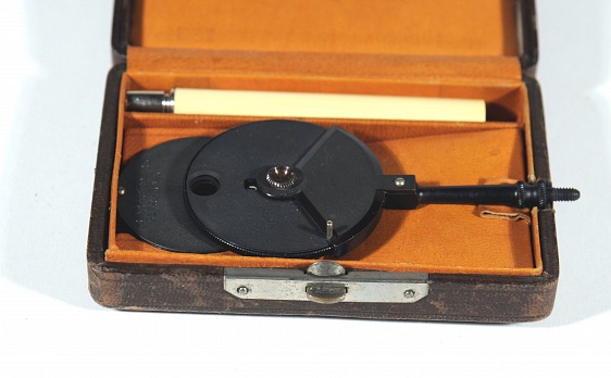 Description: Ivory handled Loring Ophthalmoscope in a paper covered case 4“x2.5“x1” with a tan leather lining. Handle detaches and the connector from the eyepiece protrudes from the bottom of the case. There is a lens in a compartment in the bottom of the case. Lens from 0 to +7, -8. Four additional powers, mirror for light is rectangular.