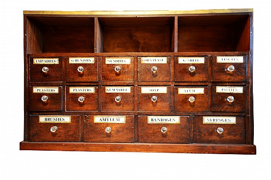 Description: 16 drawer apothecary cabinet with glass covered labels, cut glass knobs. Modified to have a shelf on the top divided into three parts. 50“x 31“x 9.” Made of dark brown mahogany. Brass fitting on top shelf. The original is the cased drawers that were removed from an old English pharmacy and then modified as shown. The empty cabinet is shown and also an image of the cabinet as modified a large number of old labeled bottles with contents in the compartments above that were added. Various antique medical items are displayed on the top when it is in use.