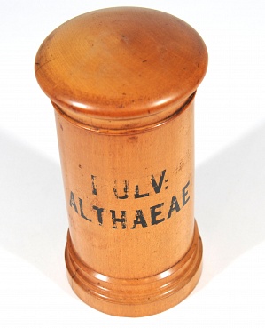Description: 6.25“x 3.1“d wooden jar, turned. Labeled in black Pulv:Althaeae.