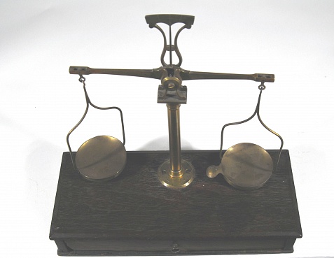 Description: Because of its easy portability, this was called the Army Prescription Scale. Beam is 7.5”, stands 9” high on a wooden box. The drawer has a chip of wood missing. Box is 11×4.75×2” and can contain entire unit. Weights are missing. Scale construction is brass including the pans.