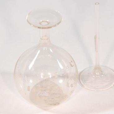 Description: 5.5×2.5d lacquered tin can with label Specific Gravity Bottle and Directions, can contain a funnel and a blown flask lablelled by hand engraving 15 degrees C, 1000 grains, WT and Co. There is a compartment in the lid 1×1.25“d which is empty. According to illustration in reference this contained a counterpoise weight.