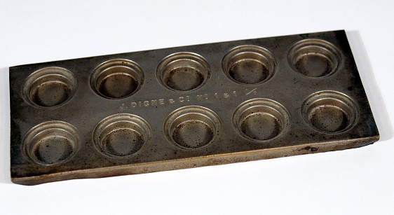 Description: 7×3x .25” metal plate with 10 .75” depressions each .25” deep with .12” rim for making cachets (primative capsules made with rice paper).
