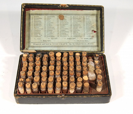 Description: 7“x 4“x 2” black leatherette box contains 70 1.6“x 0.25” corked vials , numbered with homeopathic pills. Also on the side is a 3.5” x 1” block of wood with 6 extra vials which can be lifted out. An extra larger vial is lying in this space. In the lid is a label with a directory of the compounds by number.