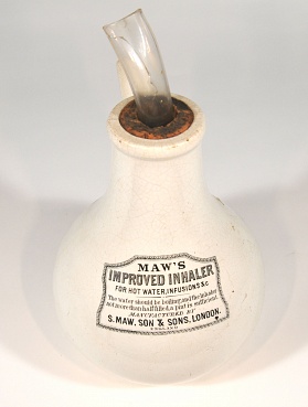 Description: 8” h x 6“d earthenware jug narrows to a neck with a cork in the 1.75” mouth and a flat glass tube inserted in the cork which can be placed in the mouth. There is also a three inch side spout. Label says above for hot water, infusions, etc. The water should be boiling and the inhaler not more than half filled, a pint is sufficient, manufactured by……….