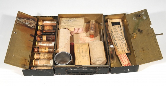 Description: Black metal box 7“x 4,75“x 3,25” opens with two wings to reveal central compartment and two others lids. Each closed with a sliding metal rod. Note inside identifies it as dating from 1899. Contains boric lint, medicine cup, Carters little liver pills, bandage, ligatures, ruler, quinine and in one compartment 9 vials of various meds mostly Burrows Welcome tabloid brand.
