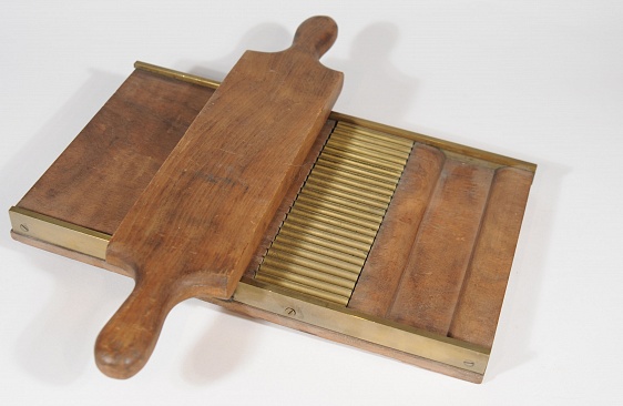 Description: 12× 7.25 × 1” oak board with brass banding and foot on one end. Other end has 1.5” indentation and above it 2.25 “ wide brass plate with 24 1/4” groove by 2”. There is a second piece 14.5” with matching brass plate and two bearings on each side to roll down the board and to create tubes from a pill mass. These are then cut on the pill tile.