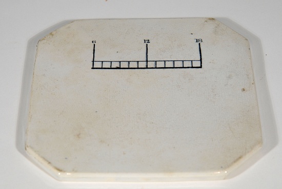 Description: 6“x 6” with angled ends earthenware tile with white glaze, top surface has a 3” rule graduated in 12 divisions with lines marking 6,12,18.