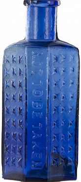 6 1/2” x 1 1/4” x 2” six sided trapezoid bottle embossed like the other poison bottles on the site “Not to be Taken”. Instead of ridges, this bottle has multiple small triangles on two sides in the front to alert the user of danger. The bottom is embossed 6 oz. A smaller one oz version in blue is also shown. The smaller one measures 3 1/4” x 1 1/2” x 1”.