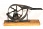 Description: 4.75“x 1.25” circular iron ring with 8” handle embossed as above sits on a semicircular ring mounted on a 11.5“x 3“x 0.75” board. The ring can be turned and the distance from the surrounding ring varies from 1.3” to 0.25.”