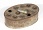 Description: 5 3/8 × 3.5 oval tin box with top containing 12 molded pewter suppository molds each bullet shaped 5/8 × 1 5/8. The top with the molds can be lifted out as a separate piece from the bottom. Each mold is lipped and lifts out individually. The base is meant to be a water cooler. Compare to the vaginal version.