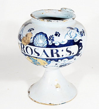 Description: Blue glazed earthenware pot, many cracks, 7.5“x 6“d, decorated with shells and cherubs. S. Rosar: S. in an escutcheon, all of the printing is dark blue, the cast a very light blue, jar has open lid and a small spout.