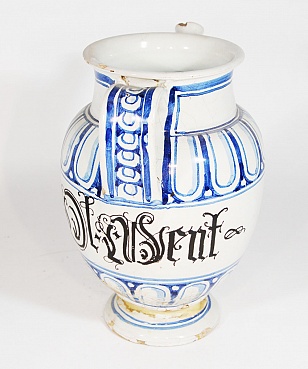 Description: 8.5×6” syrup pot, in good condition. Decorated with blue mock gadroons, probably an original from Savona in the Province of Liguria. Decoration is in dark and light blue. Labeled Ol. Went.