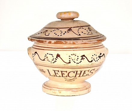 Description: 7.5“x 6” beige glazed jar with brown trim. The word Leeches is written on the bottom. The decoration is lines and dots. There is a hole for air at the top of the jar. The pot is glazed both inside and out and there are decorative handles built into the sides. Possibly Dutch.