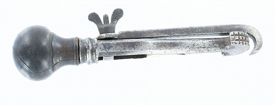 Description: 5” long with 1.5” wooden knob shaped handle. The body of the instrument, which is steel, ends with an arc, which is subtended by a hook shaped arm, the distance between the arm and the arc is adjusted by a screw mechanism activated by turning the handle.The entire device could be placed over the tooth and then the arm tightened to hold it firm. The arm is notched and the there are ridges on the arc to enhance the grip. This ancient “plier” probably broke more teeth and jaw bones than it fixed. The pelican was invented by Guy de Chauliac.