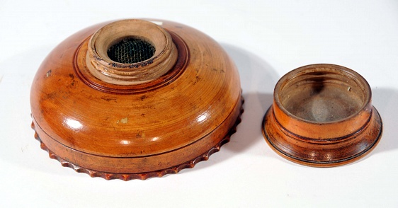 Description: 4” diameter wooden bowl 1.25” deep, has a 1” hole with a wire mesh and a 2.25“x1” base that screws onto it resembling a pill roller. This was a sieve for filtering powdered medications.