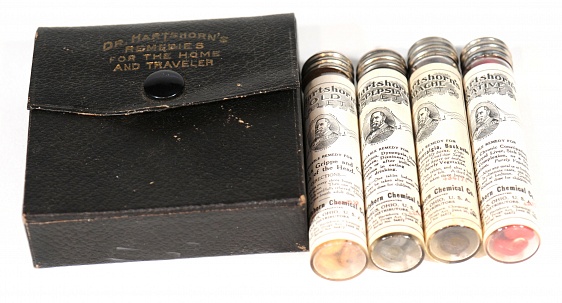 Description: 3.25“x 3.75“x 1” black leatherette case with label inside, embossed Dr. Hartshorn’s Remedies for the home and traveler. Contains four screw capped vials with pills and labels for indigestion, headache, constipation and colds and associated claims. Picture of the Dr. on the label.