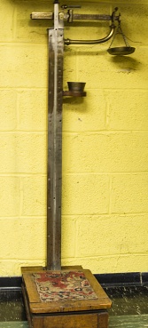 Description: Doctors scale, platform base with tapistry covering. Wooden upright with sliding nickle plated measuring rod for height. Beam is brass with brass pan on end of beam on three chains. Set of nested weights calibrated in strones, 2, 4, 6, 16. The balance rod is 14 lbs, one stone, and has a 16 oz rod on top in addition. There is a small box on the base of the apparatus to store the weights.