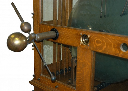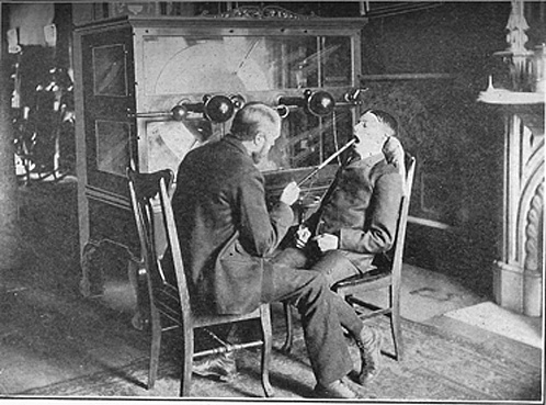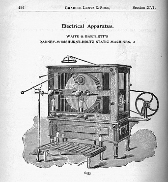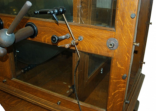 Description: This Oak Framed glass cabinet houses five large glass discs for generating electrostatic current and three small ones in a sub division.There are two brass bulbs mounted on arms that collect the electrostatic charge and deliver the electric current. The various attachments are shown in the illustration from the Charles Lentz Catalogue (ref 36). It is 5’ x 27” deep x 62” wide. At the turn of the century there was a debate about the use of electrostatic machines for generating X-Rays. These machines had been used since the 18th century to provide electric therapy. There were many smaller home versions, but the large ones were used by physicians and could generate a sizable current. They soon disappeared from use as it became apparent that the amount of current they generated was inadequate and alternating current machines took their place. Also shown here is the original small glass X-Ray tube. The patient stood between the tube and the physician who used a hand held fluoroscopic device. There was no shielding, but fortunately the current was low. Among the attachments listed in the catalog are: insulated platform, conductors, leyden jars, crown for static breeze, adjustable holder, concentrator standard, full set of electrodes. A similar Static Machine, shown on another page is said to be “without doubt one of the best and most reliable to be found…….It is also an excellent machine for X-Ray work.” The photo of the patient receiving electric therapy is from Snow (ref193). The primative tube that was used for the machine is on this site.