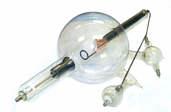Description: Complex tube, Tungsten filament, serial # 55579. The tube is 22” long and has a 7” bulb. There are also two complex chambers extending from it as in the photo. This is probably a Hydrogen Tube. The 1919 Victor catalogue advertised Hydrogen, Helium and Gas tubes. Hydrogen was thought to stablize the vacuum of the tube better than other gases. Hydrogen refers to the residual gas in the tube. The Victor X Ray Corporation was founded in 1883 as the Victor Electric Corporation.It was incorporated into General Electric in 1920 and in 1930 it was replaced by the General Electric X Ray Corporation.