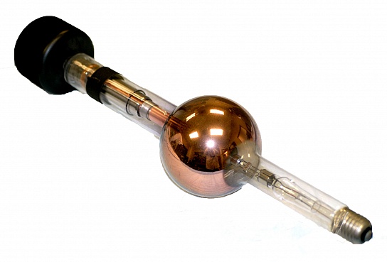 Description: 18.5” long tube with 3.5” globe 1/3 of the way. One end is a socket, the other a solid copper rod, (7 plate baffle held by screw). The rod leads to an expanded target at one end opposite a source of electrons from the screw end with a tube within the tube. The round part of the tube is stained violet from the radiation. On bulb is imprint, Coolidge Tube, GE and serial no. 81714, 30 ma, patent nos. See another without baffle.