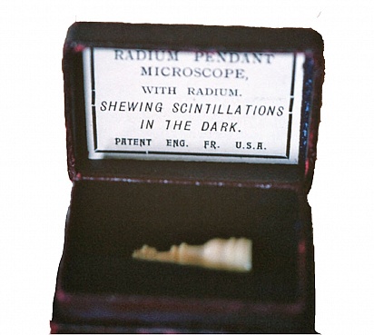 Description: A red box 1.5“x 1“x 0.5” embossed on top Radium Microscope, label on the bottom reads “Micro scintilloscope F. H Glew etc.” Label in lid Radium Pendant Microsope showing scintillations in the dark, patent Eng., Fr., USA. Contains a 0.75“x 0.25” ivory piece shaped like a chess pawn with a lens at head end and hollow with viewing plate at the base inside. The device is not shown here as it was lost at a loan exhibition But it is cited because some years ago I purchased a carton of instruments from the descendant of a Glasgow optician who had been interested in X-Rays. The carton was contaminated with radium. This spinthariscope was in the carton as well (Blaufox, MD, Constable AR: Antique Hazards: A Latter Day Encounter with Radium. J. Nucl. Med.24:79’82, 1983). Also contained in the carton was a vial of radium, shown here in a protective lead glass container and of radioactive shellac for for coating luminescent dials both of which were contained in a small wooden box in the carton . The entire story is discussed in detail in the article cited. On further surveying of the box, it turned out it contained some cotton-like material and two vials; on one that it contained about l7 pCi of activity. One vial was handwritten “Radio Varnish”, and on the other vial “Spirit of Turpentine”. The reverse side of both vials was labeled “F. H, Glew, Surgical Radiographer,Silver Medal (HighestAward, Paris 1900), 156 Clapham Road, London S.W.” Shown as noted in its protective lead glass that was prepared later. These rather innocuous-looking objects containing an unidentified clear fluid were of particularinterest,since in England the surgical radiographer was the rough equivalentof the radiological technicianin the United States. A small corked vial was retrieved from the box containing about three cm3 of a coursepink powder labeled “Radium Compound” “0.4 Admiralty Specification” “2 gr”.
