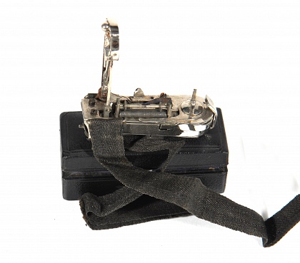 Description: 3.5” x 1.5” x 1.75” black paper covered box containing 2.5” x 3/4” x 3/4” metal sphymograph, which completely collapes into the box. The stylus can be activated by lifting a metal holder and pulling out a rod on the bottom. It is wound by turning a knob on the top and turned on with a lever.