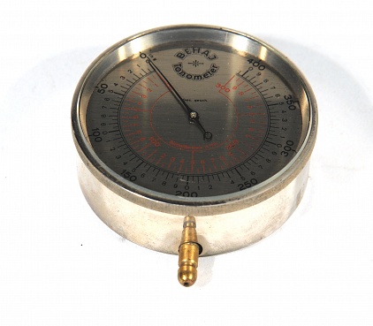 Description: 2.5“x1 anaeroid calibrated in mm Hg and cm H2O. Type described by Von Recklinghausen. Contained in a leather pouch 7” long with a cloth cuff 4.5” and a hardened rubber pump.