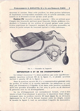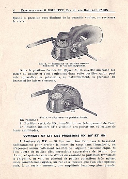 Description: 10×7×3” black box contains a 5×4.5 triangular shaped steel gauge with one scale from 0 to 20 for oscillations and the other 0 to 300 mmHg. Labeled Oscillometre de G. Boulitte. The gauge has outlets for the cuff, a switch to determine the minimum and maximum oscillation, and to switch from pulsations to pressure. The bulb is in the red cloth lined box, C00169 and the screwdriver is present.
