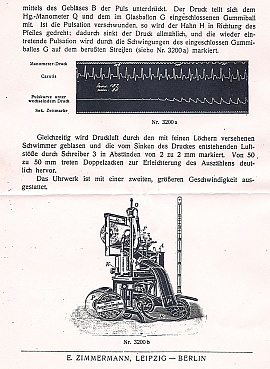 Description: 13” tall in original walnut case signed E. Zimmermann, Leipzig, Berlin No. 75. The case drawer contains the case key, winding key, and nozzle fitting disk. Cast iron stand with original black enamel and gold outlining, glass cased bladder under stand (Erlanger type) with two levers to direct air flow, platen with working drive and timer, three pens, one to manometer with float to show B.P. This elaborate device demonstrates the complexity that was achieved in monitoring physiologic functions related to blood pressure. Multiple measurements from multiple sources were possible with recording that permitted careful analysis.