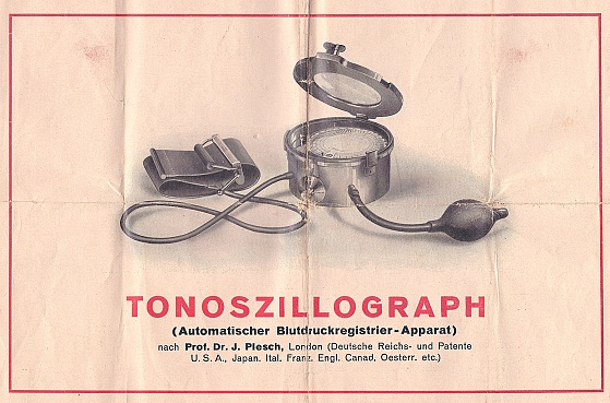 Description: 6“d x 3.25“h steel case has a glass viewer on top with a plate with a pen. The plate holds a circular graph and the revolution and the excursion of the pen are controlled by air pressure from a port. A second port is also present and a dial marked A and Z to open and close the top. The whole is contained in 7” sq pine box, which also contains the cuff and the original instructions.