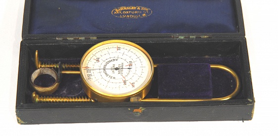 Description: 6.5“x2.5“x1.25” black box with blue velvet lining holds 2“d x 0.5” gilded circular gauge calibrated in mmHg from 0 to 250. The name Hawksley is written in ink on the handwritten gauge and the word Patent. Attached to the gauge is a 6” long metal loop with spring feet and extending from the bottom where the springs are is a 3/8” sensor on 0.5” rod which activates the needle to read the gauge. Also a ring.