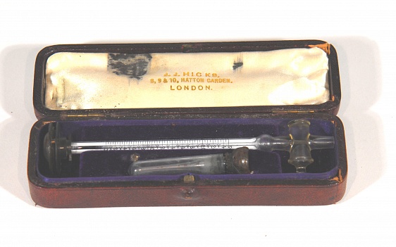 Description: 6“x 2“x 1.5” red leatherette box with Mnfr inscribed on inside lid. 5.5” long glass tube with glass valve at one end and composition housing at other end holding a rubber membrane which is now quite hard. Calibrated by hand to 250, which is 2.5” or 1 cm therefore 0.25 mm/unit. Has a vial with hard rubber stopper, which is perforated and inner tube to prevent spilling, probably carried mercury.
