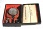 Description: 6 “x 4” x 2” red lined box contains a 2” circular manometer with white metal case. It is calibrated in cm of Hg from 0 to 35 and is labeled manometer, 755. There is a ring handle at the top and a nipple outlet. A three way stop cock is labeled Ch. Verdin. It connects like a T with one limb, which can be turned to open and close.The original pelotte is in the case with part of the rubber tubing. The original instructions are also contained in the case.