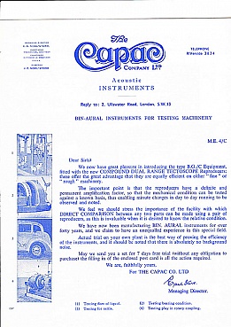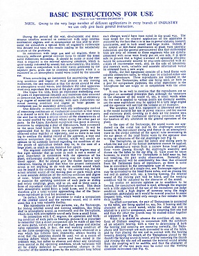Description: 13“x 9.5“x 2.5” brown, stained ash box contains ear piece adjusted with central screw, four bells and parts of two sets of tubing. A 6“x12” cover contains holders for the tubing and lifts out of the empty compartment. Three heavy bells are each 2.5” x 1.25”. One bell is 1“x 1”, which screws into center of any of the other three to provide a localizer for the sound. Two of the bells each have a narrow hole, which may fit a missing piece.Peter Noel-Storr was kind enough to send me the following comments: “My grandfather Charles Edward Noel-Storr founded the Capac Co Ltd in Barnes, London in the 1930’s. Whilst he did supply many hundreds of stethoscopes to the medical profession, the example pictured on your website was produced for use in industry particularly in the fields of automotive and aero engines as well as the water supply industry. Both his medical and industrial stethoscopes were — sold well into the 60’s, and in some cases I suspect are still being used to this day.” He sent me the instructions for use of the device that are shown here along with the stethoscope.