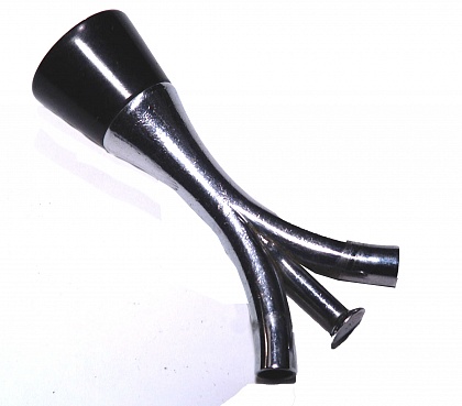 Description: 3.75” nickle plated stethoscope bell with thermoplastic end. There are tubes to connect two rubber tubes and a rod between them with a round end to use for pressure from the finger.