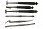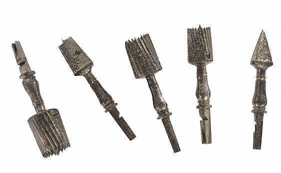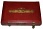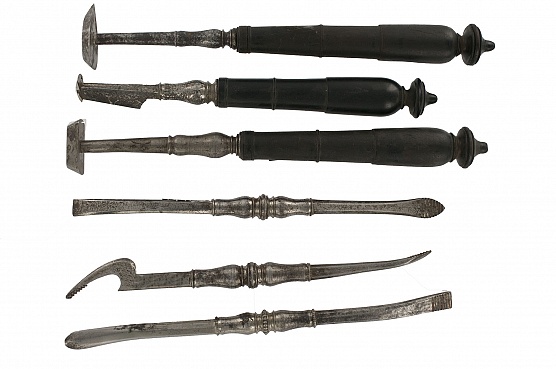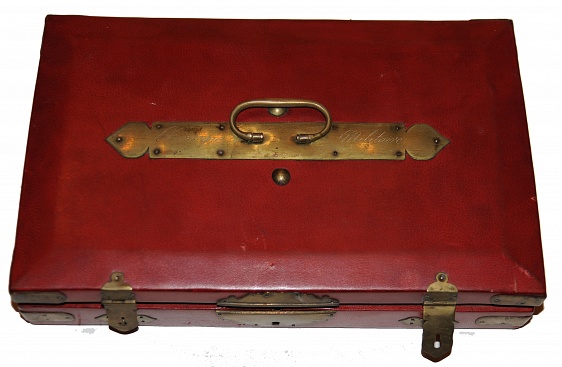Description: 13“x 8“x 2.5” red leather covered case of trepanning instruments including brace, seven attachments for brace plus wooden handle, bone brush, 2 elevators, 3 lenticulars. The instruments are made of steel with ebony handles. The case is lined with an 18th century type material. The brass plate on the lid reads Chirurgie Militaire. Smaller sets are more common without the brace. Trepanning, also called trephining has been practiced at least as far back as the ancient Egyptians and evidence exists of its use in early civilizations in the Americas. Quite possibly it was used to release spirits from the skull of ill persons, some may have benefited when their abnormal behaviour was the result of an injury and a subdural hematoma. One hand held all steel piece has a screw end for initiating the hole. That would be followed by using one of the bits to open the hole to its full extent. The bits have screw tips in the center to place in the initial hole to guide it.