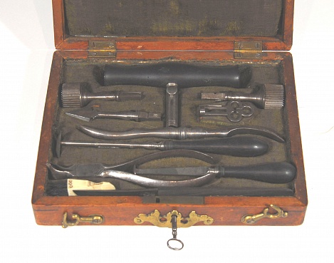 Description: 8.5×6.5×2” fruitwood boxed set with green velvet like lining. Contains 11 pieces including trephine handle, 3 trephines, trephine key, two lenticulars and one elevator,Sharps forceps, ivory handled bone brush and scalpel. The scalpel is marked with a crown and an e. No other piece marked. 4 pieces have black ebony wooden handles.
