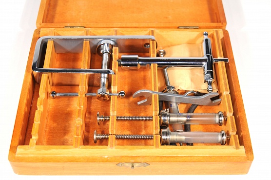 Description: 9.5“x 7.5’x 2” blond wood box with wooden partitions contains a stainless steel clamp shaped device to attach to a table, an upright t shaped stand, which screws into this, labeled Dr. Koster Apparatus with one end of labeled Don (for Donor) the other Rec (for Recipient). Also contains three 2 ml syringes with spring loaded plunger, steel fittings, extra fittings, tubing. Syringes have a picture of a barber pole with x emblem. The top of the t is open as are the arms. The top is also labeled Don (Donor) so there was a flow of blood from the donor to the recipient using the t as the pathway. A very rare relic of donor to patient transfusion.