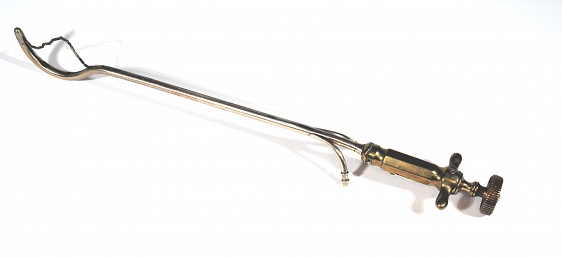 Description: 15” brass ( nickle plating probably lost ) instrument with knob on end which adjusts a chain on the other end to which was attached a membrane. The chain sits in a deep curve so that the bladder could be separated into two halves. There are two tubes which exit downwards at the other end to allow catheterization of each half of the bladder.